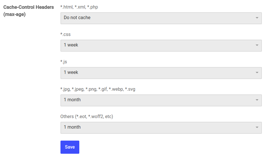 Selective Cache-Control Headers (max-age) May 1, 2018 By: Claudio Benvenuti In: Product changelog - You can now set different max-age headers for different types of files. This will allows your users to always have fresh content, continuing to leverage browser cache for static resources such as css, js, images, fonts, etc. Tags:feature « Docker environment resources upgrade Deploy cache purging fix »