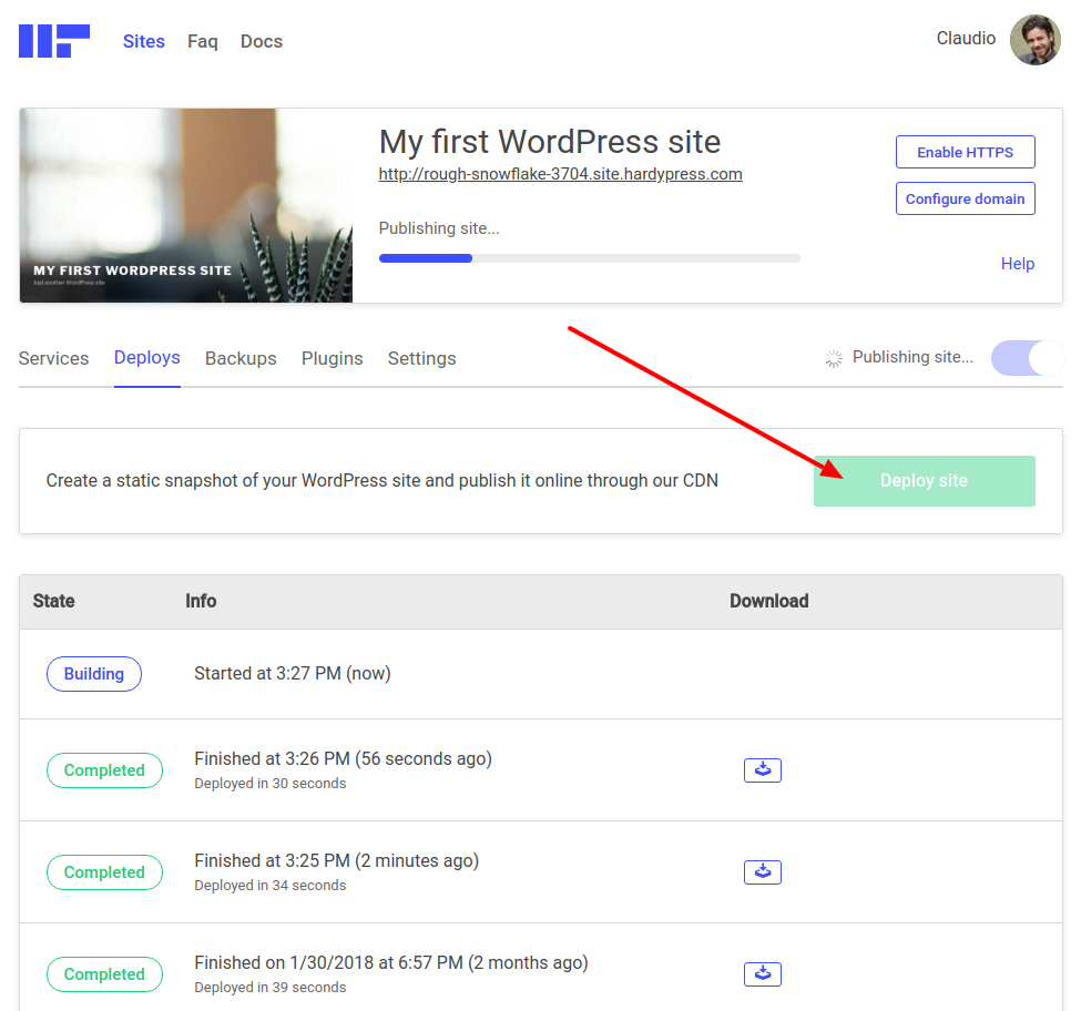 Once the scarping ends, HardyPress puts all the generated files online and delivers them through a CDN. The time needed for generating the deploy strictly depends on the size of the site. It can take few seconds for small websites to several minutes for large websites with thousand of files.
