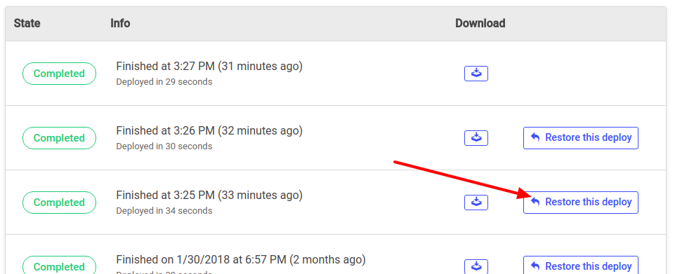 You can easily restore online an old deploy version of your site simply clicking on the “Restore this deploy” button:
